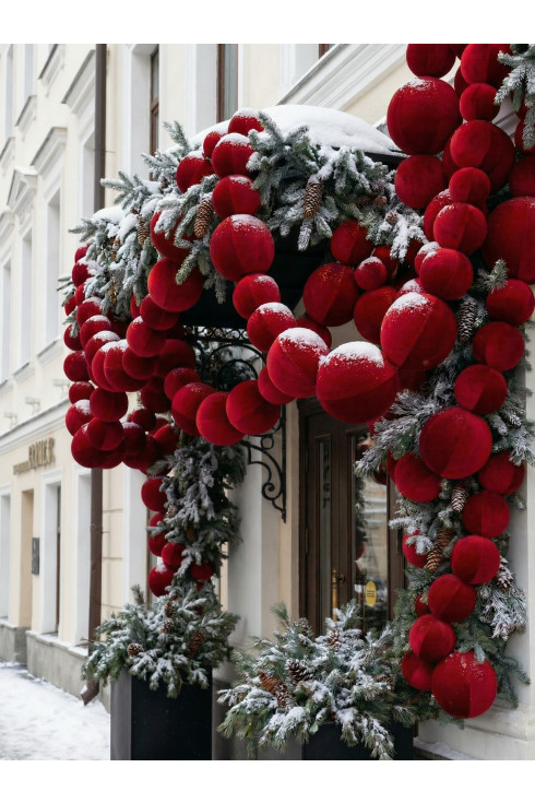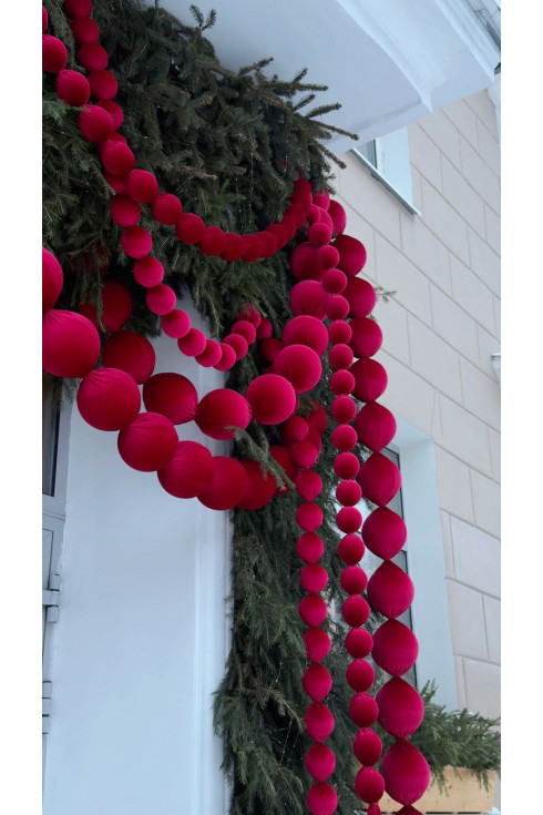 Бархатные бусы из шаров Красного оттенка — готовое решение для оформления фасада или входной группы. Цвет Красный Бархат когда важно получить насыщенный объём, чистый цвет и премиальное восприятие.