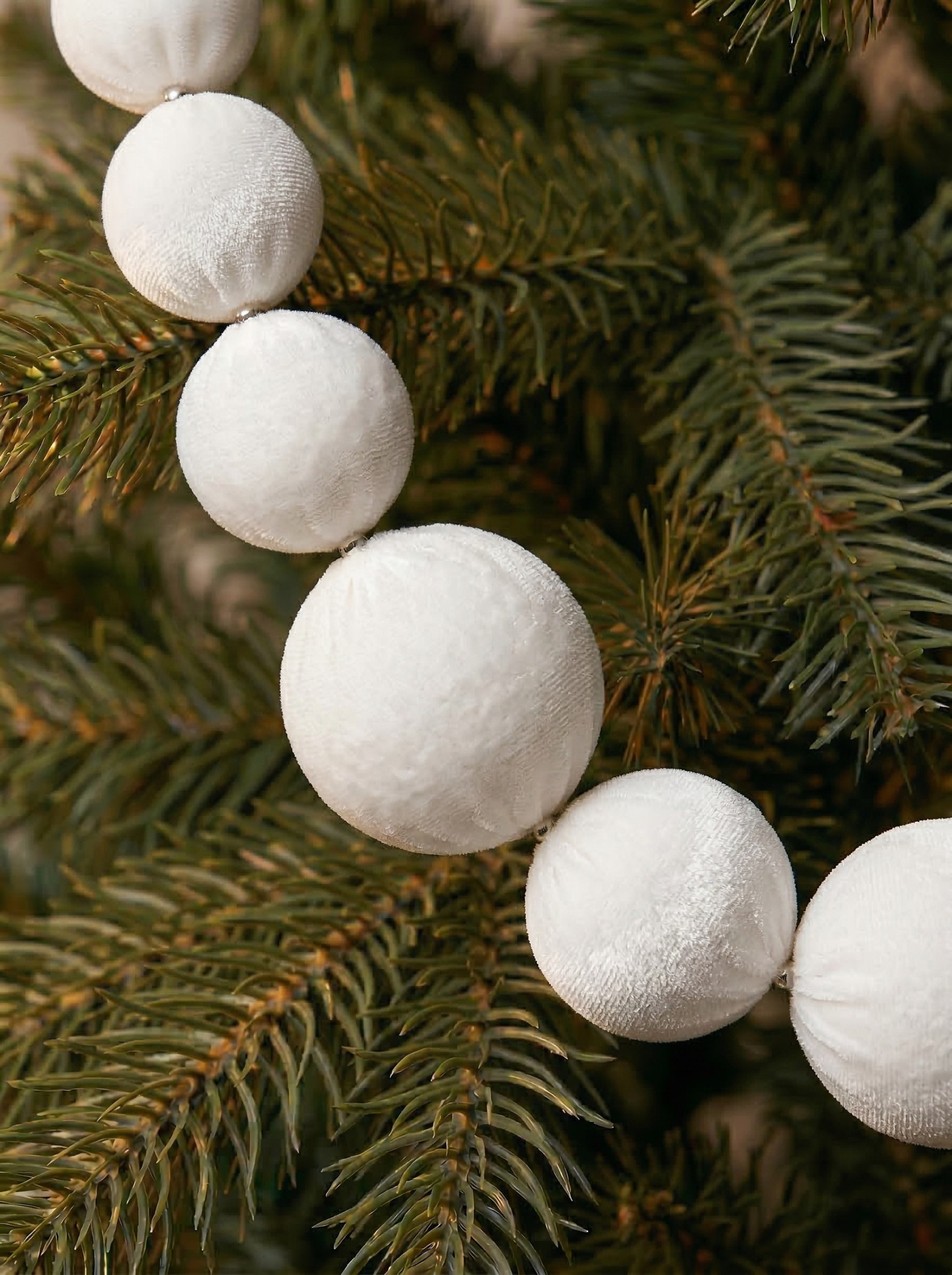 бусы на елку из шаров, белые украшения на елку, белые шары на елку, бархатные шары на елку, велюровые елочные шары, матовые шарики на елку, украшение елки белое, декор елки, новогодние украшения белые, праздничный декор, оформление елки, стильный новогодний декор